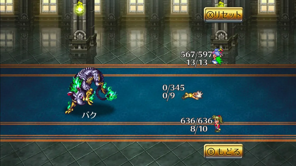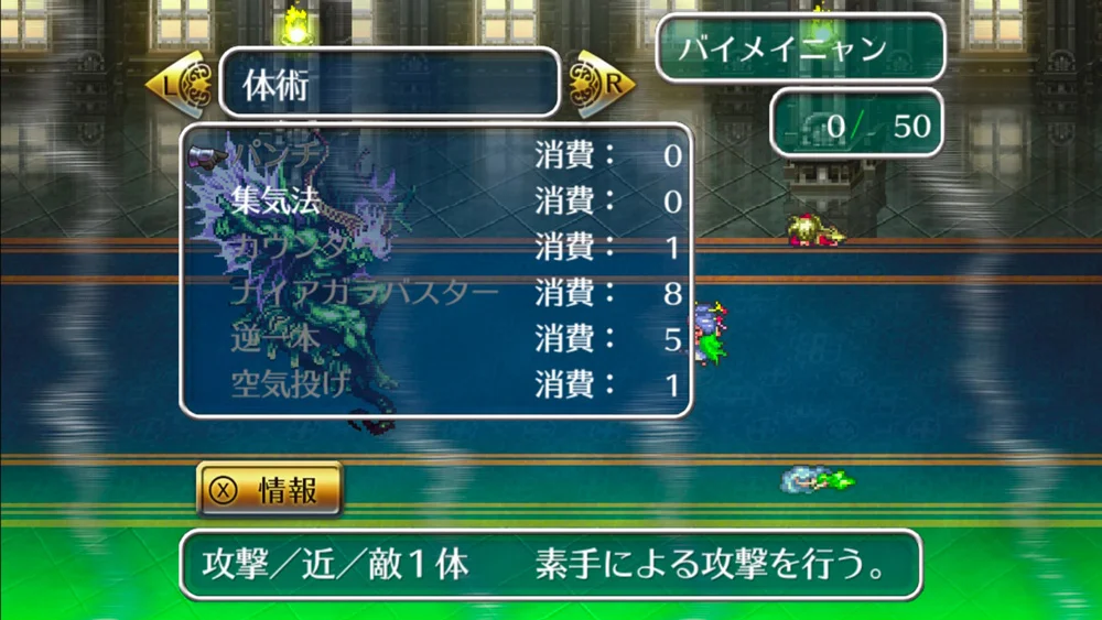一番強いけどスカ率高い「ナイアガラバスター」と「稲妻キック」を織り交ぜて戦っていたんですがWPが尽きるのが早かった。いや、装備固めてるからパンチ連打でも倒せるのよ?倒せるんだけど、全体攻撃の烈風剣で死体殴りされてエレンのLPが0になってゲームオーバーっていうね・・・あれっこれ一人旅より難しいんでは・・・?